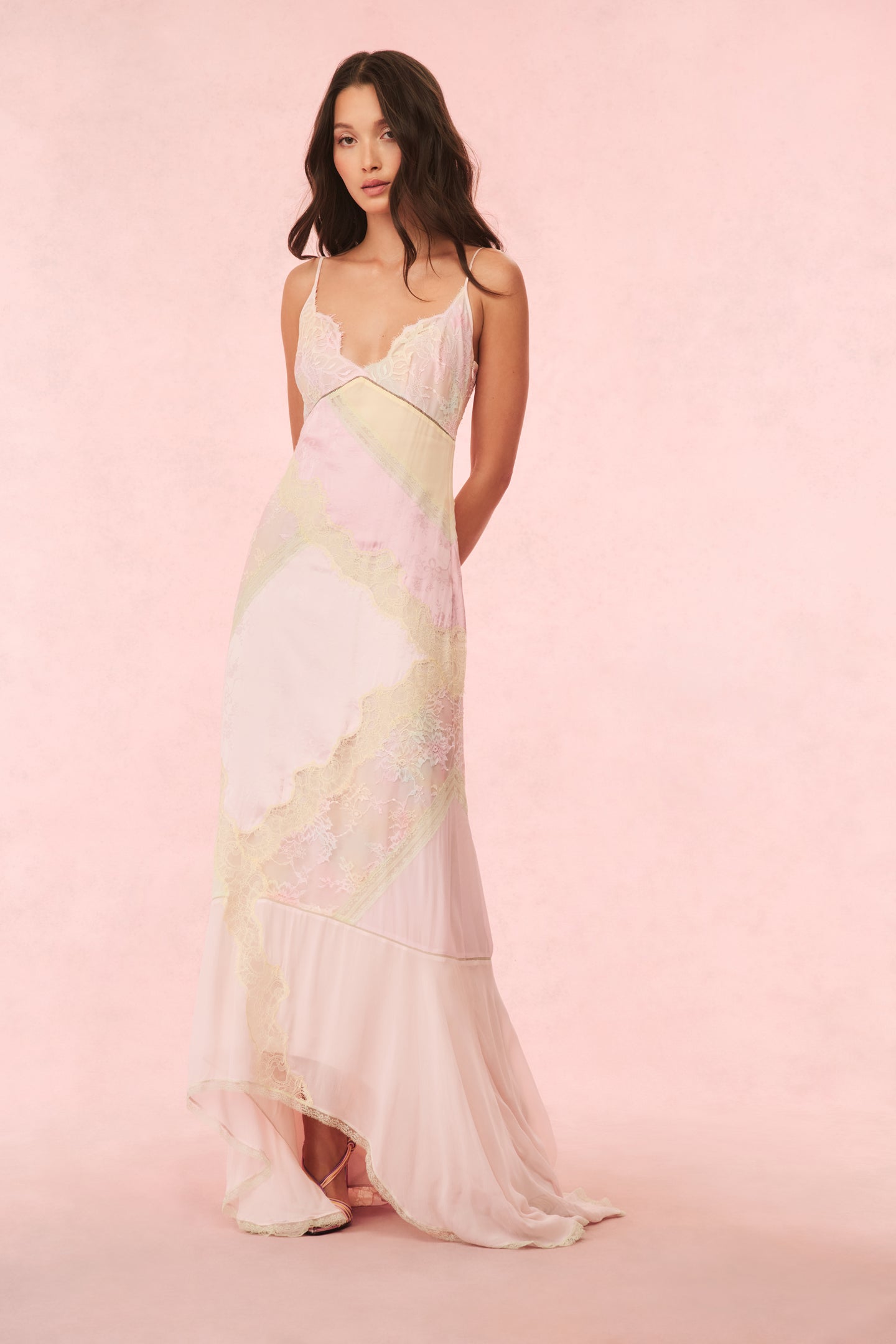 Introducing the Bancila Dress. Inspired by the early aughts red carpet fashion, this stunning party dress arrives with an intricacy of details like patchwork printed tie-dyed laces, jacquard, chiffon panelings, and delicate lace trims. This flirty, slip dress features scallop lace at the neckline, thin spaghetti straps, and a bias cut giving it a natural stretch. With a mermaid shape and high-to-low silhouette, the piece is finished with a chiffon flounce at the bottom, a triangular cut out at the back for added sexiness, and functional ties at the back. A zipper is included for functionality.?