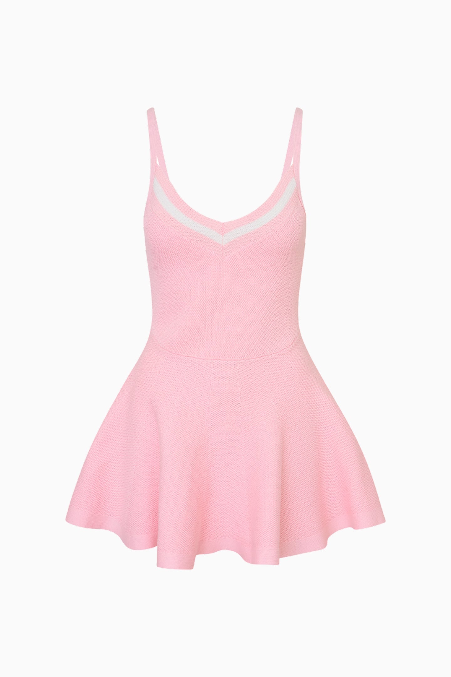 Pretty in pink in the Brinalina Dress. This sweater dress arrives for the summer with a cute contrasting stripe around the neckline giving it a feminine and charming look. The piece begins with full needle straps, a low cut back, a full, airy skirt, and an all over cuff-like stitching.?