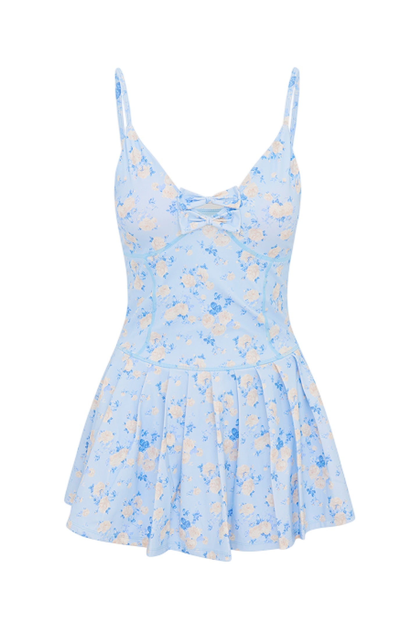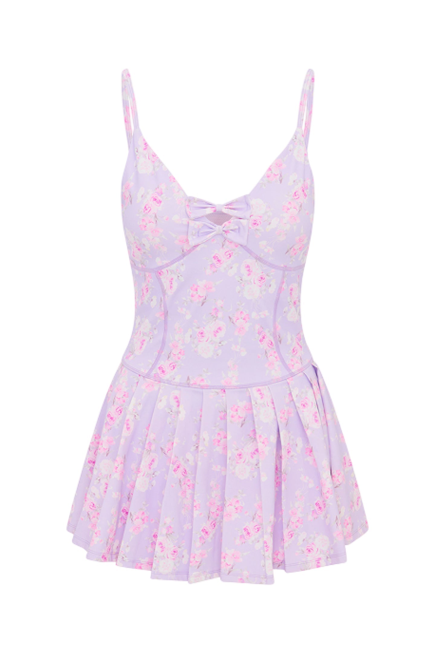 Game, set, mini. The Hubert Dress returns in our signature floral prints. Designed with a lightweight, breathable fabric, this active dress features built-in shorts for functionality, bra cups at the bust, functional pockets, princess and a center front seam. This sporty mini has thin spaghetti straps, a bow detail at center front, and an airy ruffle skirt.?